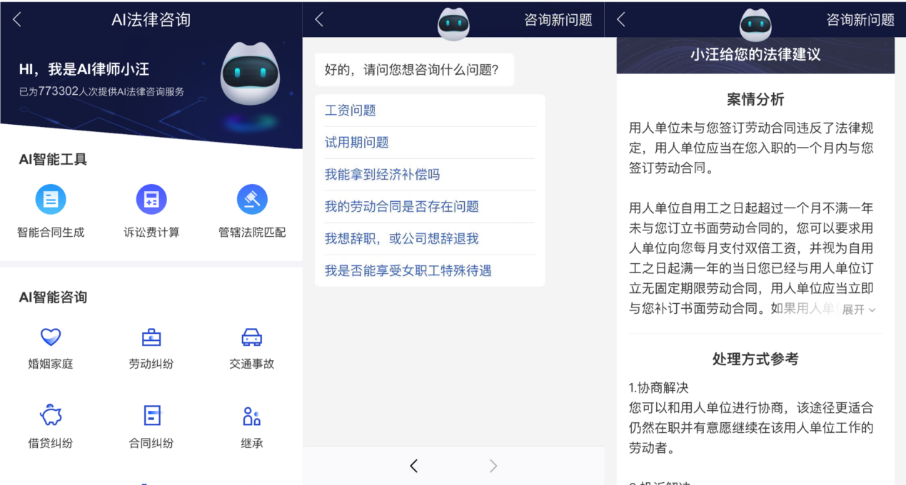 譬如,在『龙泉驿职工之家』微信服务号中,就有职工群众问到,“工作半年多了,用人单位还没跟我签订劳动合同,算不算违法?”关于这个问题,如今只需进入『龙泉驿职工之家』微信服务号下方的“服务平台”,再点击“搜狗律师”,即可进入“AI法律咨询”界面进行相关咨询。选定“劳动纠纷”选项之后,问答机器人小汪会围绕“入职是否满一个月”、“工时制度”等一系列具体问题与当事人展开一对一问答,从而理清当事人的咨询诉求及事件的来龙去脉,并最终给出分析结果:“用人单位未与您签订劳动合同违反了法律规定,用人单位应当在您入职的一个月内与您签订劳动合。”