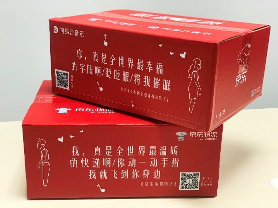 京东作为中国最大的自营B2C电商,聚集高品质的“超级用户”。作为其间纽带的京东物流,利用强大的物流供应链覆盖能力,在供需之间修筑传播“高速路”让产品更好匹配市场,让品牌声音直达用户。此次情人节合作中,京东物流的快递箱作为优质载体,将网易云音乐“石头计划”中优质的歌词IP在箱体进行呈现,走心的文案、改编的《京东小哥情歌》将浪漫的情意通过物流的形式传递给消费者,让大家在这个情人节,签收快递的同时感受到一份甜蜜的气氛。