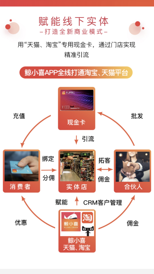 鲸小店的口号是:像阿里巴巴一样赚钱,聚客到店,轻松躺赚。目标受众便是线下实体门店,全品类门店皆可加入,借助鲸小喜实体抵现卡进行门店营销活动,在获客引流的同时,得到淘宝、天猫给予的返佣跨界收益。