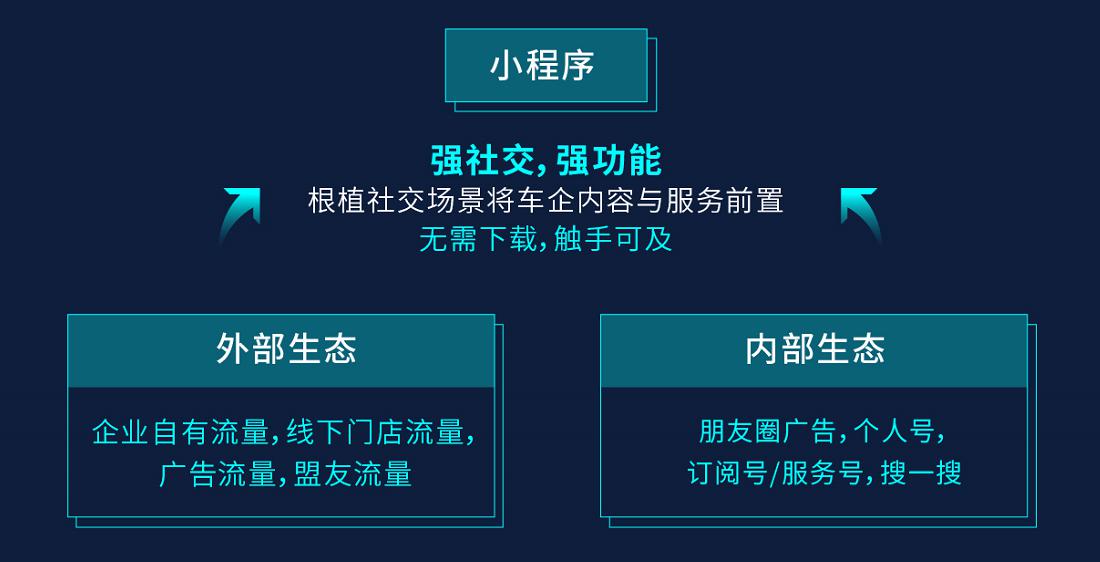 以小程序构建社群——新能源车企以强社交、强功能的小程序为核心构建社群,全面整合企业自有流量,线下门店流量,广告流量,盟友流量等外部流量资源和微信公众号广告,朋友圈广告,搜一搜等内部生态资源,获取首批车主、企业高管以及KOL等种子用户。
