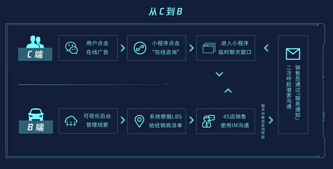 从C到B潜客直连——后续,通过新能源高效潜客直连系统,唤起C端用户与B端(经销商、4S店)之间的双向对接。即当C端用户点击广告,进入小程序咨询时,基于LBS技术,相应的B端客服人员同时被唤起,在后台响应,实现快速沟通。即使出现信号不稳定的情况,客服人员还可进行反向呼叫,带来真正的高效潜客转化效果。