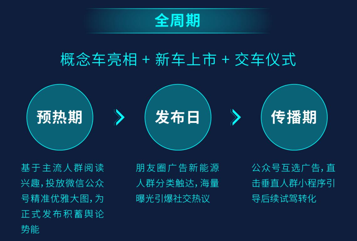 全周期——概念车亮相、新车上市、交车仪式可谓是新能源车企发声造势最为重要的节点。腾讯从预热期到传播期基于阅读兴趣、位置等场景进行全景投放,为新能源车企重要事件提升舆论势能。
