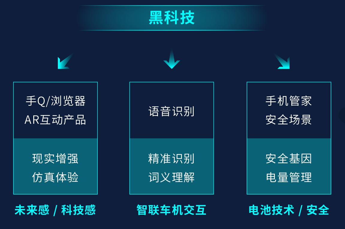 黑科技——融入腾讯黑科技的交互式广告有助新能源车企强化“智能、科技”印记。AR互动、手机QQ模拟车内场景,塑造未来感、科技体验感。通过呈现营销场景,如手机管家、安全场景体验驾车、乘车过程中的贴心服务,让用户更加放心。语音识别技术则让用户“零距离”体验智联车机交互。