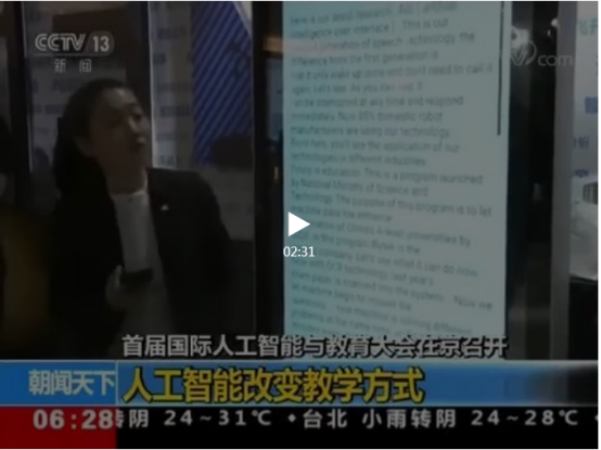 央视新闻《朝闻天下》对此进行报道,聚焦讯飞在语音识别、图片识别、口语评测等方面的进展,以及阿尔法蛋、翻译机等方面的应用。着重报道了讯飞在教育领域的应用。