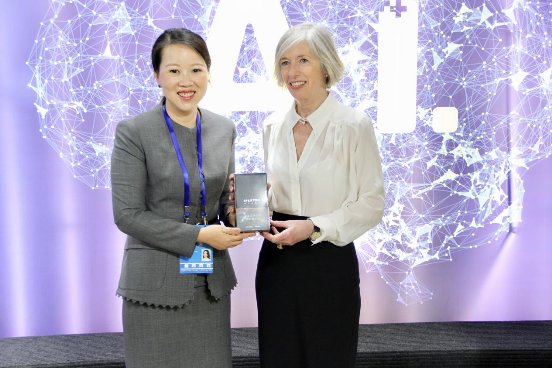 科大讯飞教育事业群副总裁任萍萍赠送联合国教科文组织教育助理总干事斯蒂芬妮亚·贾尼尼翻译机