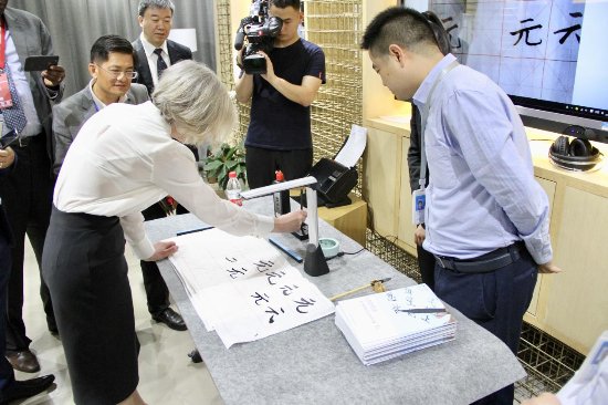 京师书法云教室采用基于云服务的产品架构,通过优质的内容、丰富的资源、完备的功能、完善的服务,全面助力“书法进课堂”的普及推广。在看完演示后,一位嘉宾饶有兴致的进行体验,感受传统书法与现代科技的碰撞的成果。