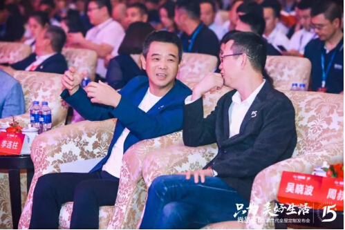 (尚品宅配李连柱董事长与吴晓波在发布会现场交流)