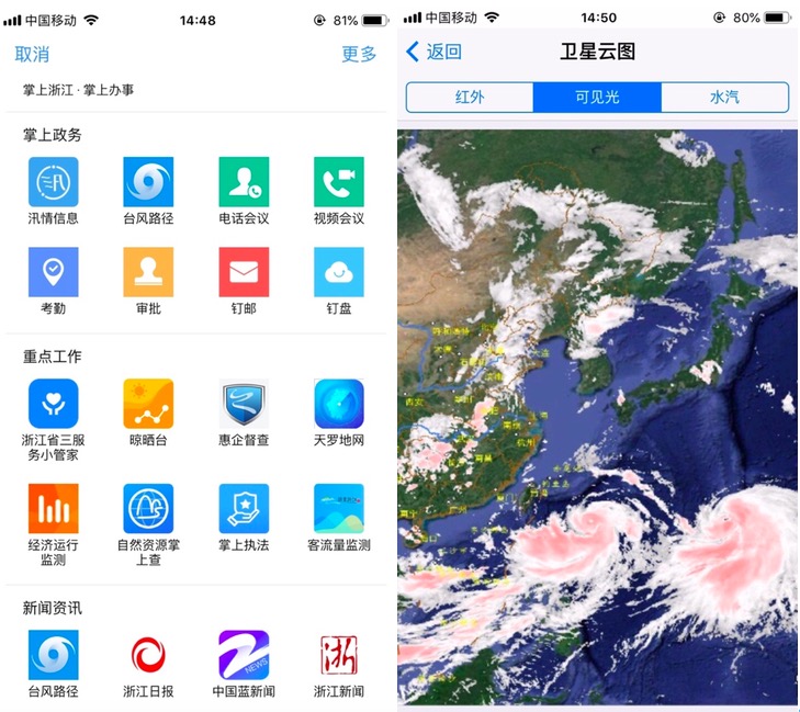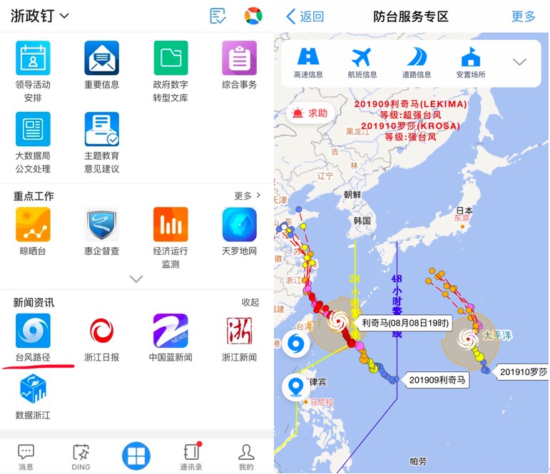 浙江沿海地市为此启动防范措施。与往年防范台风最大的区别是,台风“利奇马”的走向被全程“掌握”。浙江121万公职人员随时随地打开掌上办公神器“浙政钉”,进入防台服务专区了解“利奇马”走势,并看到相关的卫星云图。该界面交通信息、安置场所、电力抢修等防范举措一应俱全。此外,防汛部门利用 “浙政钉”高效传达防范台风指令的同时,也能随时收到一线汛情反馈。