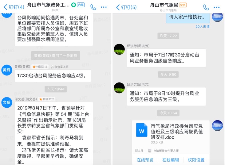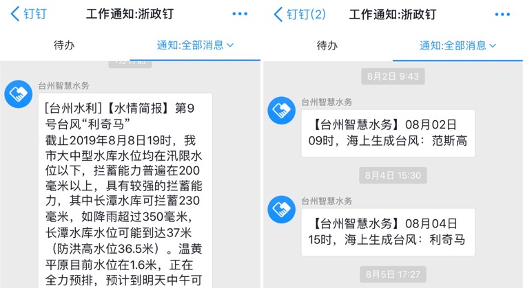 台州市利用“浙政钉”进行防范台风的指挥调度已有传统。比如三门县,2017年时已将3500名村镇干部纳入钉钉平台。当年台风汛期港闸内河水位超汛限0.03米时,防汛指挥人员通过钉钉DING功能下达调运指令任务,要求开闸放水。一线防汛人员接到指令提醒后迅速开闸,整个过程在5分钟之内完成,使水闸险情得以排除。