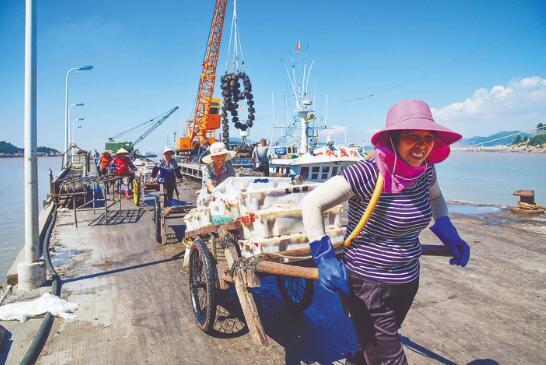 (台州玉环市坎门鹰东码头,不少回港避风的渔船已停靠岸边,趁着台风还未到来,渔民们正忙着卸货。)