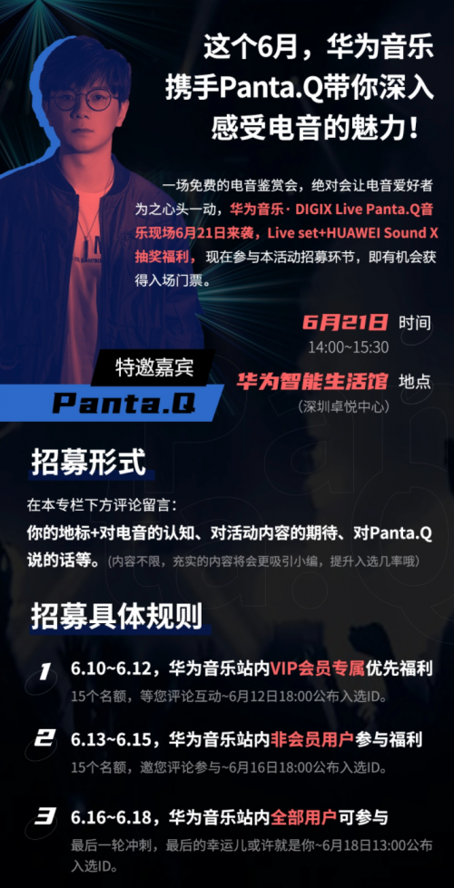 此次华为音乐·DIGIX Live Panta.Q音乐现场将在刚刚开业的华为智能生活馆(深圳卓悦中心)举办。在活动中,我们不仅能聆听到Panta.Q的现场Live set,充分体验极致电音享受,粉丝们还能近距离与Panta.Q分享其关于电音的感受与体验。他传递出的音乐态度是极其有温度的,本真、纯粹,打动人的心灵。此外,活动现场还有诸多音乐类游戏互动与抽奖环节,最高可获得HUAWEI Sound X惊喜大奖哦!