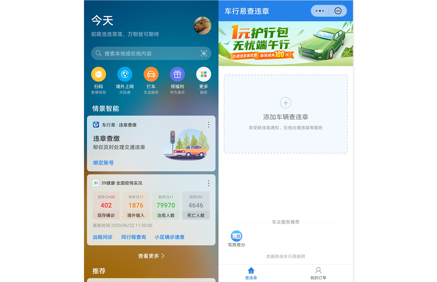 华为智慧助手·今天联合车行易,在端午期间推出违章查缴服务,包括实时违章信息提醒和在线办理违章。当有违章行为产生时,智慧服务会生成违章信息卡片,提醒用户有违章行为,同步线上缴费处理违章,缴费后查看订单进度,直至完成缴费。