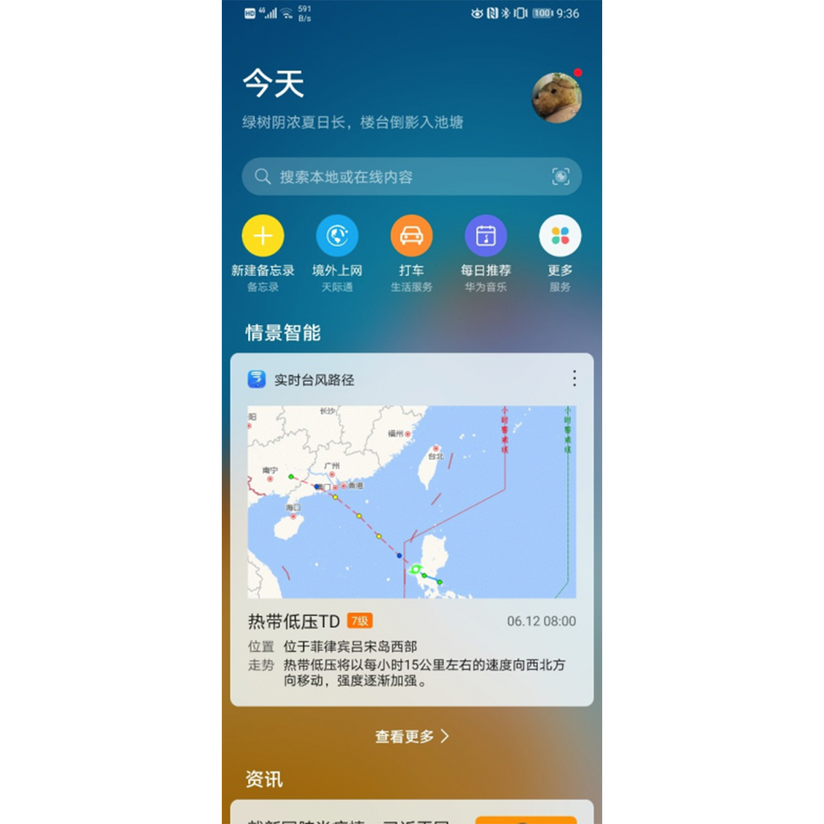 华为智慧助手·今天作为你的贴心助理,在多台风季,实时呈现台风的动态实况,用户只需右滑主屏即可查看。当用户所在地的气象台发出台风预警时,智慧服务会生成一张卡片,呈现台风的实时动态信息,包括台风生成、实时更新台风路径、到台风消失,一方面用户依据情况安排好出行,另一方面让受影响区域的用户及时防灾,减少损失。