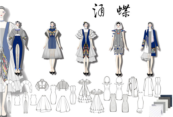 此次设计以“创想”为主题,作品汇集“创意畅想”“时尚风潮”“休闲雅趣”“田园风采”和“运动生活”五个方向,在风格上将中华民族传统文化元素与当代时尚艺术充分融合,创新时尚理念和设计,真正实现了艺术“创意”与服装时尚的“无界”状态。