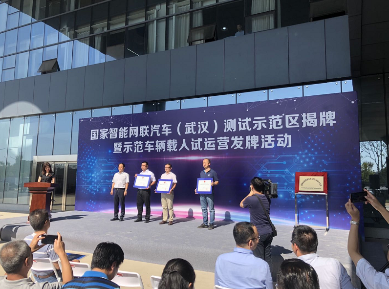 国家智能网联汽车(武汉)测试示范区正式揭牌,同时武汉市交通运输局为深兰科技等三家企业颁发了全球首张自动驾驶商用牌照。