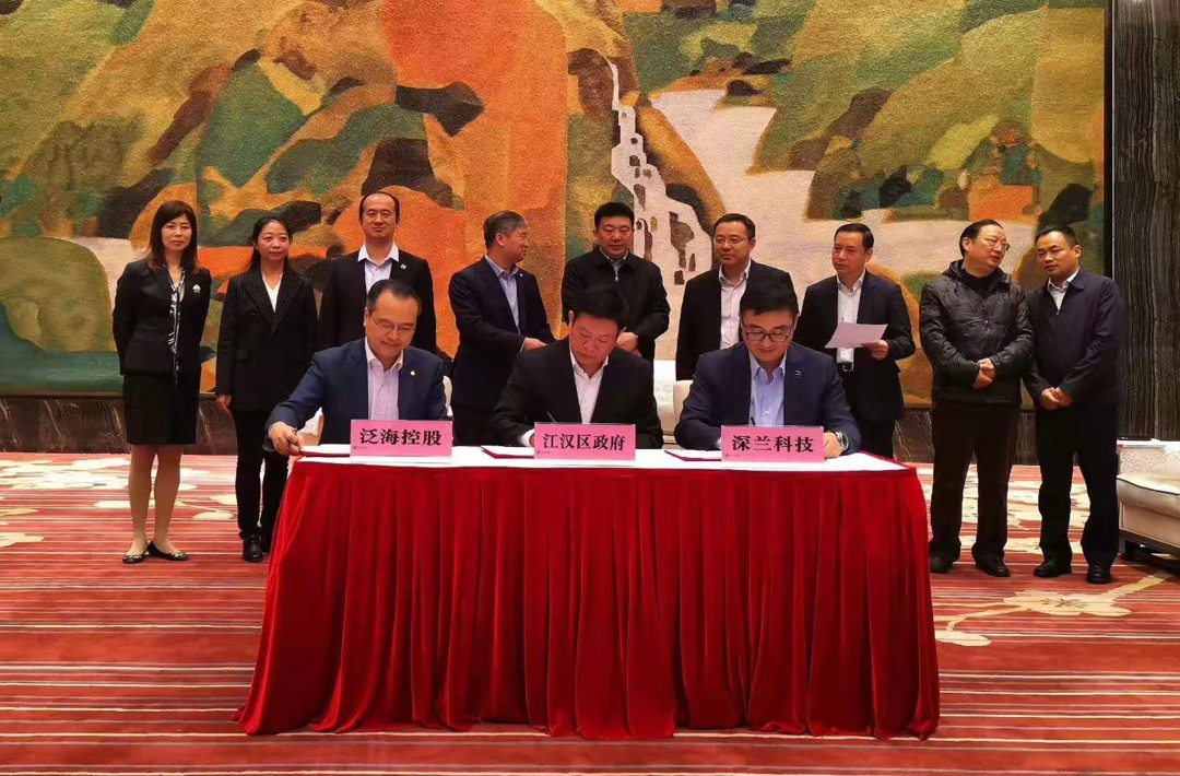 从左至右:中国泛海控股集团执行董事、执行副总裁张喜芳、武汉市江汉区人民政府区长李湛、深兰科技董事长陈海波。