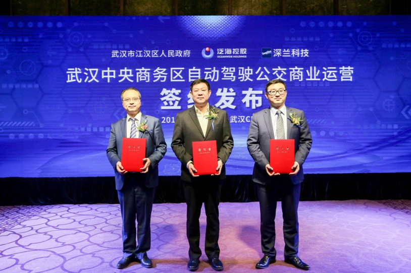 在周先旺市长及市主管部门领导见证下,江汉区人民政府、武汉运营公司与深兰科技共同签署三方合作协议,国内首条无人驾驶商业运营路线落户武汉CBD。