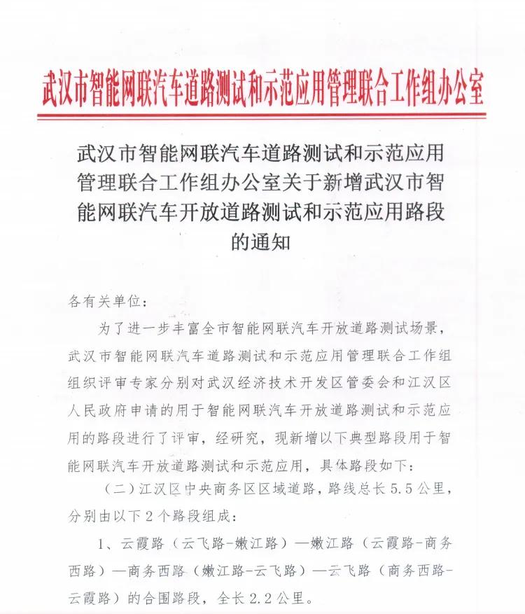 武汉市智能网联汽车道路测试和示范应用管理联合工作组办公室正式下发新增路段通知。
