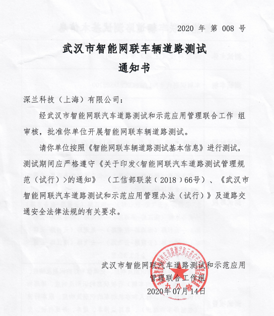 武汉市智能网联汽车道路测试和示范应用管理联合工作组办公室正式下发道路测试通知书。