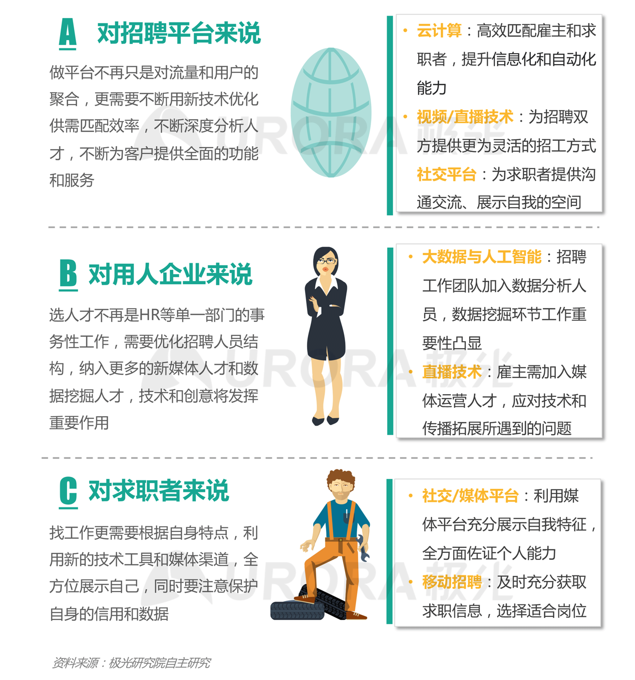 1、科技的进步深刻地影响着招聘行业的发展,驱动招聘行业运作模式的迭代变革,在云计算、社交媒体和移动互联网的交织下,让更多人拥有公平的求职机会,也提升了招聘行业的运营效率;