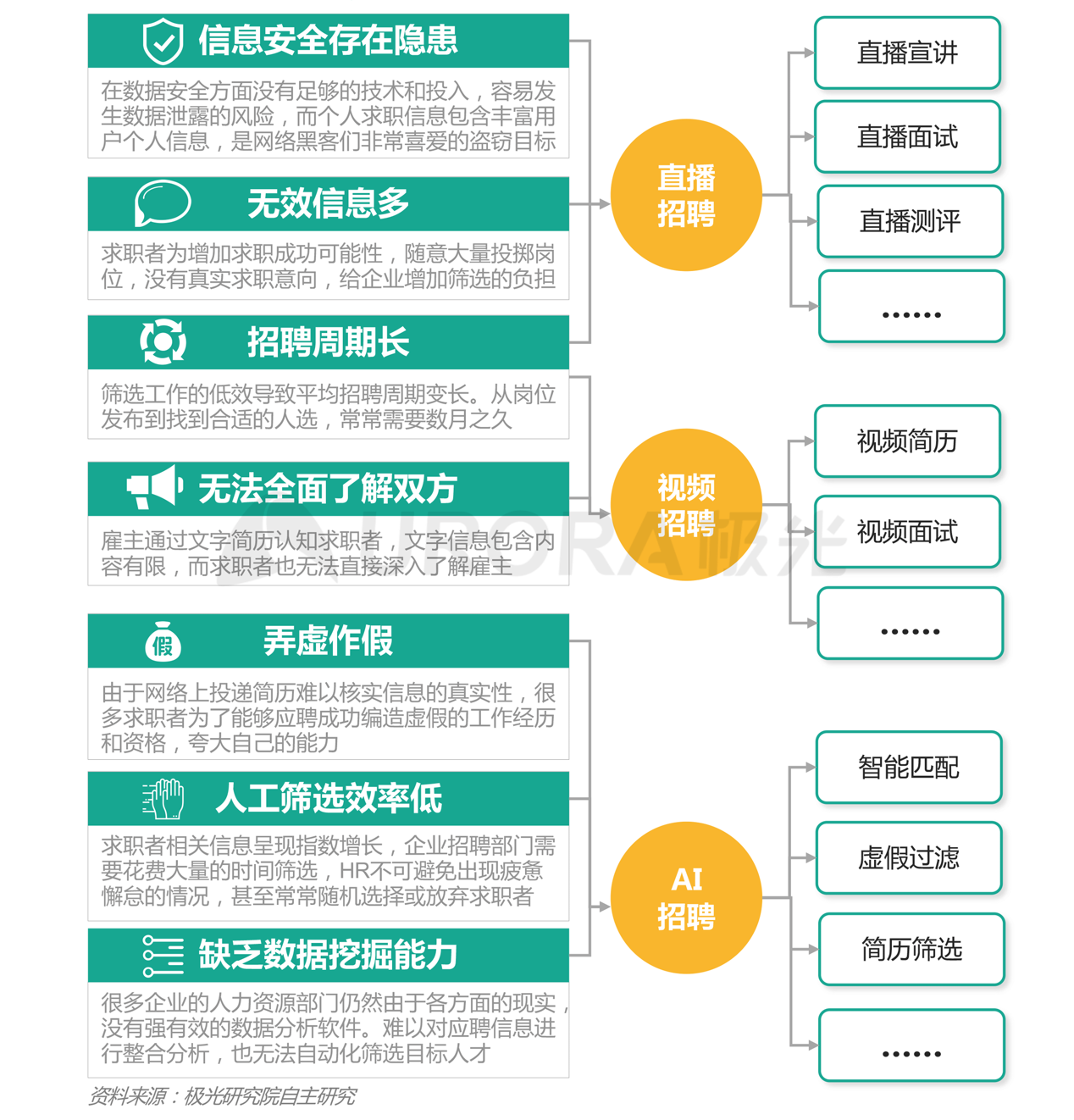 招聘岗位数量的激增和细分化以及行业数据化困境,推动直播、视频、AI三大技术在招聘行业快速普及应用。