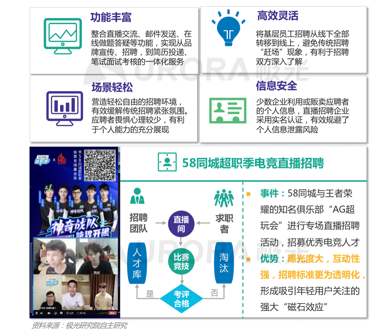 所谓“直播+招聘”(简称直播招聘)即基于特定的直播平台,将招聘环节直播化,招聘企业和应聘者双向互动,近距离接触、了解,实时交流,以提高双方匹配的效率。58超职季电竞招聘引入“直播”形式,一方面以其灵活形式提高招聘的曝光度,提升雇主品牌价值宣传,另一方面电竞活动互动性强,直截了当筛选识别优秀人才,以透明性增强其公平性。