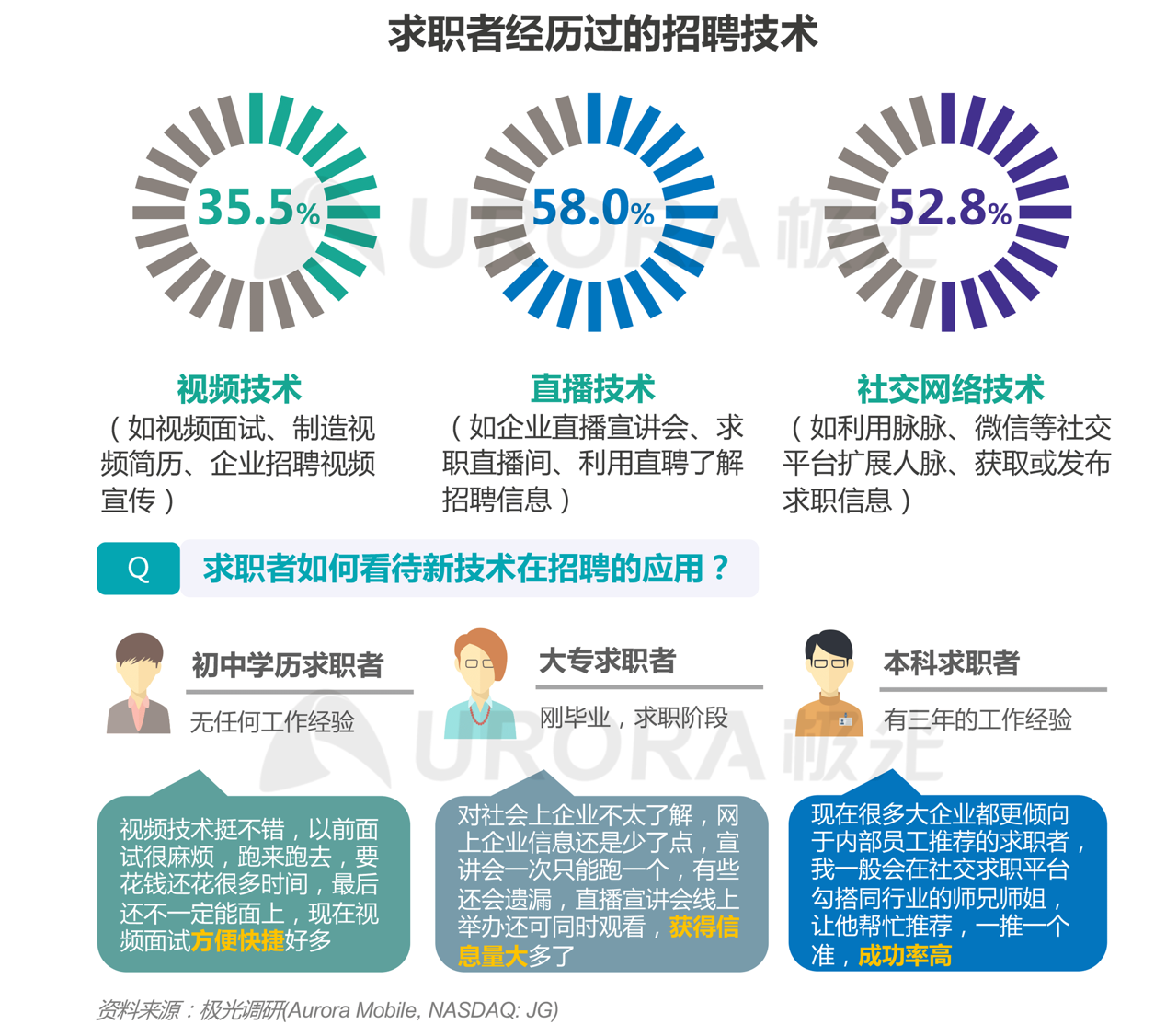 5、极光调研数据显示,求职者基本都体验过招聘新技术,特别是超过一半的求职者体验过直播技术和社交网络技术,新技术已逐步成为求职者不可或缺的求职利器