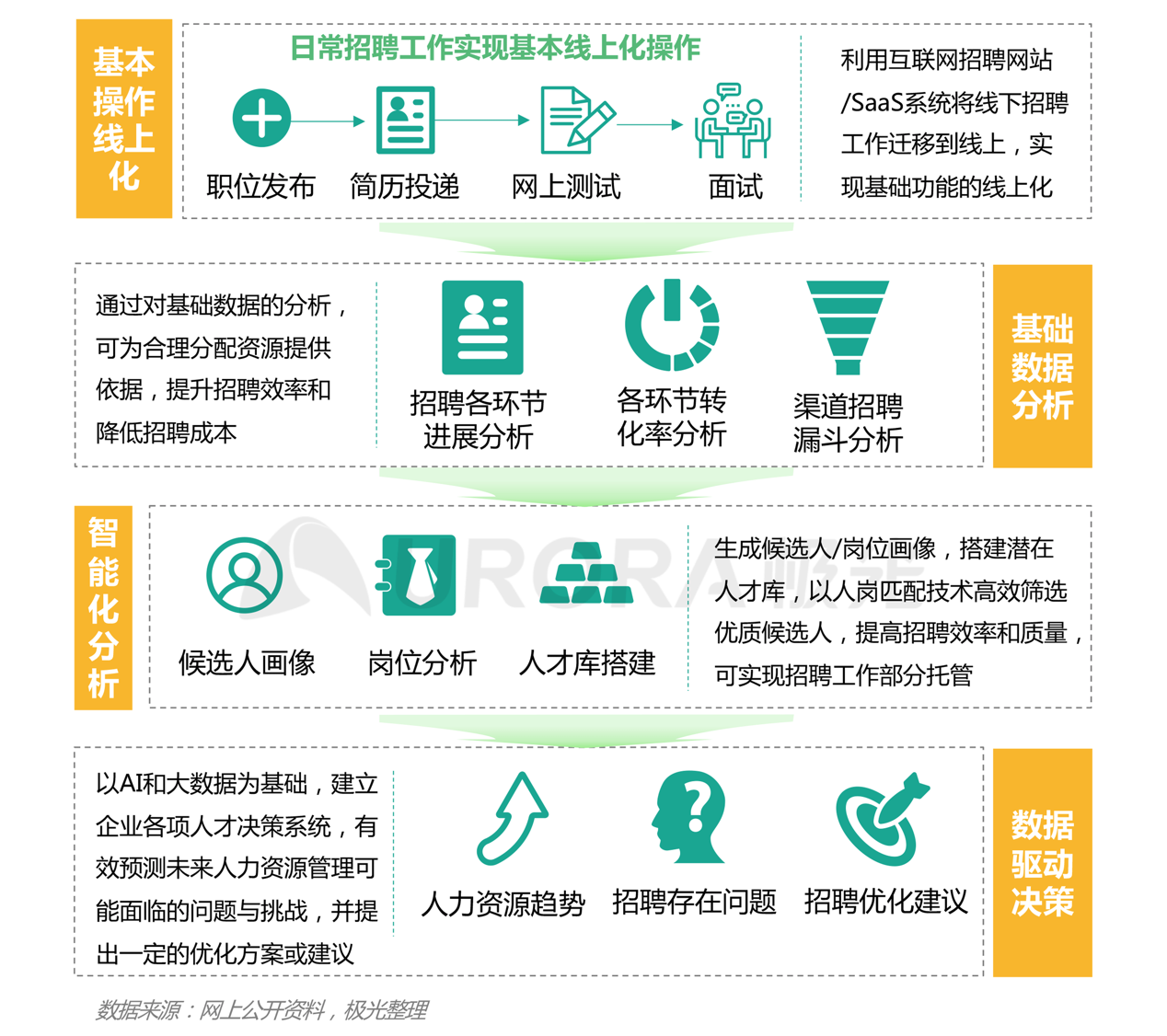 目前大部分企业已经实现基本操作线上化,将日常招聘工作从线下迁移到线上,并使用了诸多新技术带来的便利功能,大幅提高工作效率。在招聘基础功能已相对健全后,智能化数据分析能力还有待进一步提升;未来的招聘行业将持续深化技术应用,并将长期以新技术伴生发展,彼此促进,快速进步,产业链的多个环节也将因此受益。