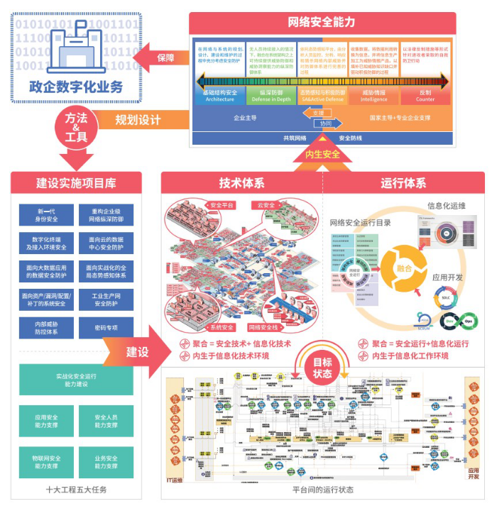 对此有专家认为,在数字化转型、新基建建设中,需要有一套行之有效的、以系统工程方法论结合“内生安全”理念而形成的网络安全规划建设框架,引导政企机构规划和建设网络安全,使网络安全逐渐从边缘走向核心、从外挂走向内生、从“走形式”转向“实战化”,推进网络安全向基础设施化、服务化模式发展。