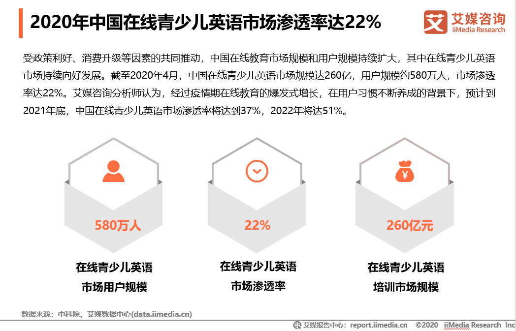 在政策鼓励、AI技术进步的环境下,K12在线教育的市场规模进一步扩大,2019年用户规模近2500万人,预计2020年将突破3700万人。截至2020年4月,中国在线青少儿英语市场渗透率达22%。艾媒咨询分析师认为,从企业长期发展来看,K12在线教育平台应回归本质,以在线英语教育为例,更需要立足在线英语教育的优势,以科技加持提高课程质量与师资力量。在在线英语之外,K12在线教育也应开拓下沉市场以及海外市场。
