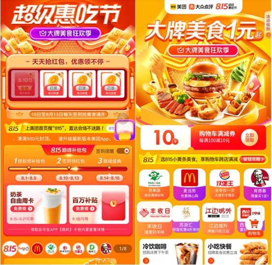 据了解,本次“815超级惠吃节”自8月1日开启,将持续至8月31日,其中8月14日至8月16日为活动爆发期,有专属815特供低价美食、美食购物车跨店满减。用户在美团App或者大众点评App首页搜“815”进入活动页面即可参与。