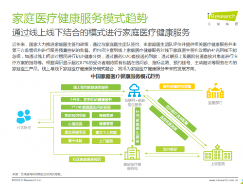 知名市场调研机构艾瑞咨询近期发布的《2020年中国家庭医疗健康服务消费白皮书》中就显示,有87%的受访者期待拥有包括在线问诊、指标监测、预约挂号、主动随访等服务在内的家庭医生产品,而线上线下融合的家庭健康服务模式也成为未来行业发展的方向。