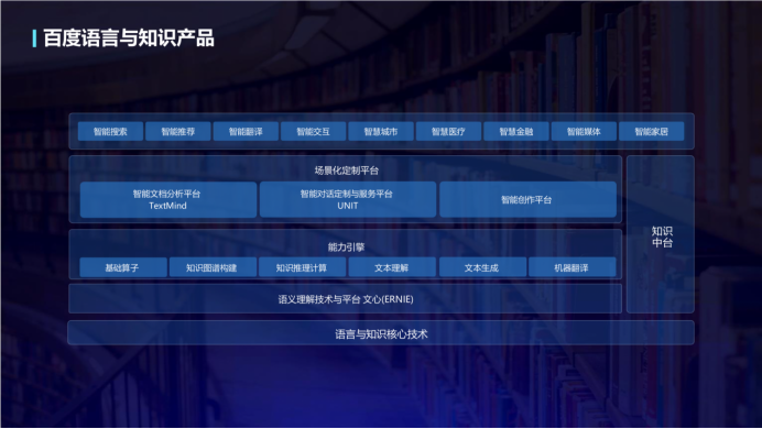 百度大脑语言与知识产品以语言与知识核心技术为基础,提供语义理解技术与平台文心、多个能力引擎、智能文档分析平台、智能对话定制与服务平台、智能创作平台以及知识中台,支撑智能搜索、智能翻译、智慧金融、智慧媒体、智慧城市等各行各业的应用。