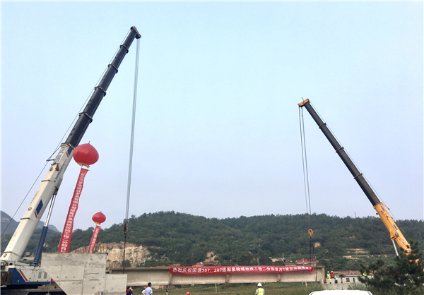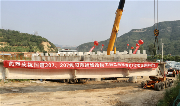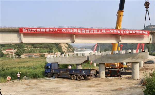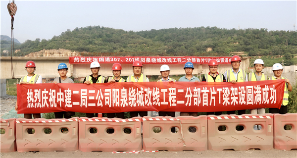 8月28日16:08,由中建二局三公司基础设施分公司承建的国道307、207线阳泉市绕城改线工程二分部首片T梁架设成功,由此拉开了阳泉绕城改线工程二标段桥梁架设施工的序幕。