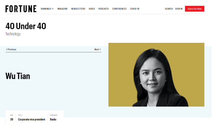 (百度集团副总裁吴甜入选《财富》杂志“40 Under 40”榜单)