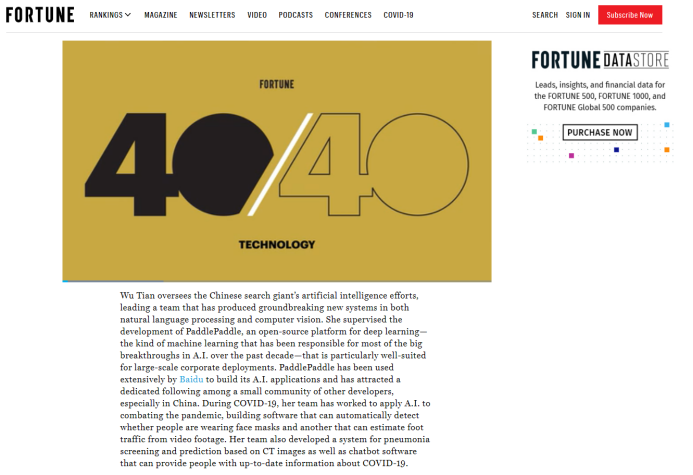 据了解,今年《财富》杂志“40 Under 40榜单”的评选工作更着重于候选人职业生涯发展及行业影响力,以及在未来创造更大成就的潜力。而吴甜所负责的以飞桨为代表的AI平台,已经成为智能时代的重要基础设施,将加速各行各业的智能化升级,在疫情期间更勇担社会责任,释放AI技术的强大动能,正彰显了AI时代的榜样力量。