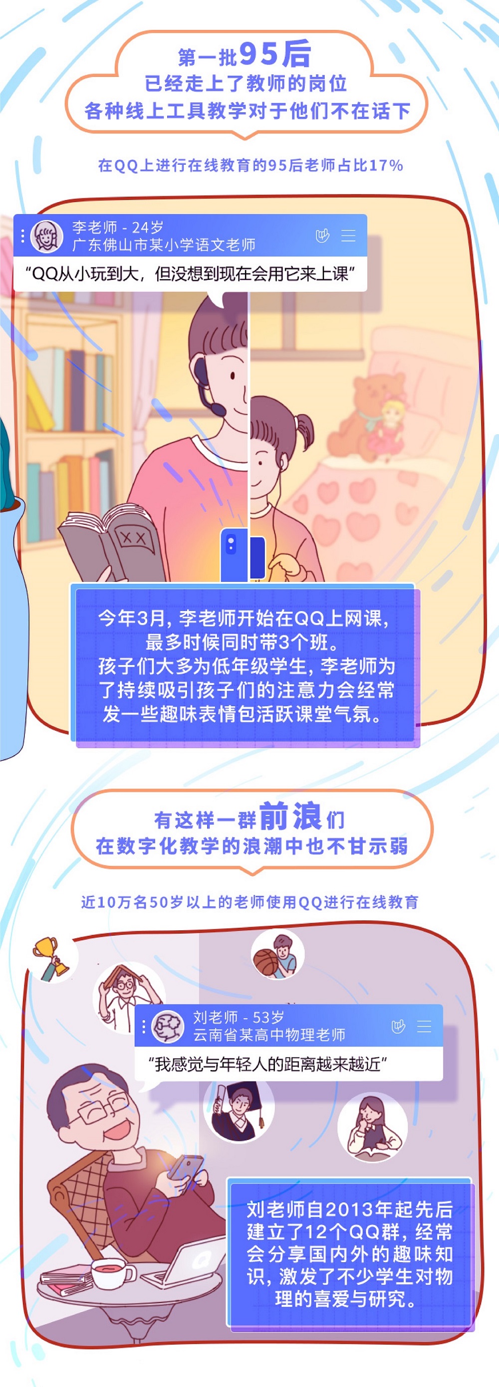 而作为“后浪”的95后李老师,则有自己独特的网课技巧。来自广东佛山的她,为了吸引孩子们的注意力,常常会发一些趣味表情活跃课堂气氛。她说,“QQ从小玩到大,但从没想到现在还用它来上课。”像她一样的95后老师还有很多,这一群体在QQ上进行线上教学的比例达到了17%。