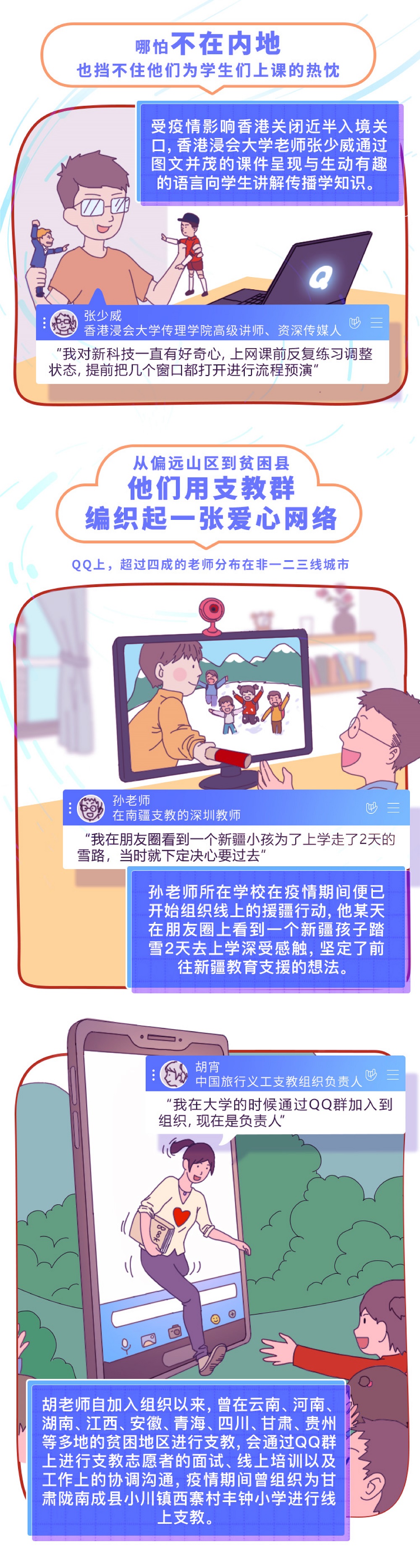除了线上授课,很多老师还会利用QQ处理教学相关工作。远赴新疆支教的李老师就通过QQ群进行了支教志愿者的面试、线上培训以及相关工作的协调沟通,让远在新疆、甘肃等偏远山区的孩子们都能享受到线上课堂带来的福利,用短短的网线连接起天南海北的课堂。