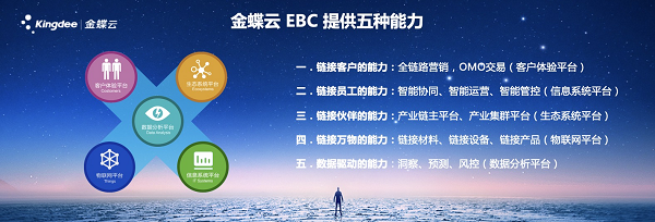 上述5个案例,展现了金蝶云EBC的一张蓝图,由5大平台和5种能力构成:客户体验平台,能够实现全链路营销,OMO交易等,帮助企业提升“链接客户”的能力;信息系统平台,通过智能协同、智能运营、智能管控,保障“链接员工”的能力;生态系统平台,包括产业链主平台、产业集群平台等,提升“链接伙伴”的能力;物联网平台,将工厂设备、产品甚至原料等都链接起来,实现“链接万物”的能力;数据分析平台,帮助企业提升数据驱动的能力,更好地洞察、预测和进行风控。