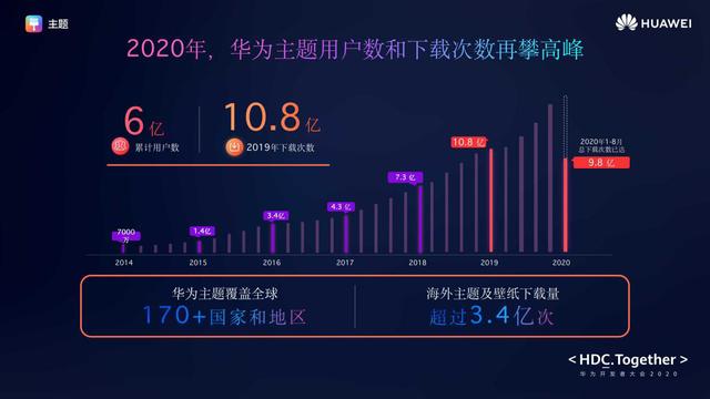 2019年华为主题年下载总量突破10.8亿次。值得一提的是,2020年,华为主题用户数和下载次数迎来了新的突破,仅截至8月31日,华为主题全球下载量已达9.8亿次,下载量达到去年全年的90%。