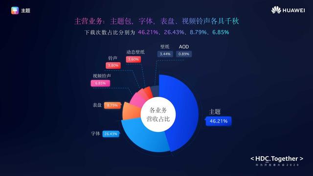为了满足更多用户个性化的需求,华为主题不断扩展业务范围。2020年,各业务营收增长迅猛,尤其是表盘和视频铃声业务,占比超过15%。