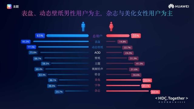 2020年华为主题用户的男女比例为65%与35%,从数据中不难看出,男性用户与女性用户在华为主题使用中,有着明显的偏好区分,男性对表盘与动态壁纸的需求相较于女性较高,而女性用户对于华为主题中的杂志、美化内容,则更为偏爱。