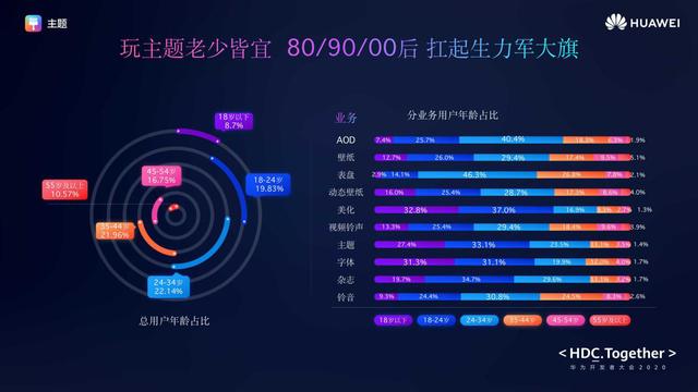 从华为主题用户年龄的分布上看,80、90、00后扛起了整个用户生力军的大旗。美化、杂志、字体等业务的年轻用户数量更多。
