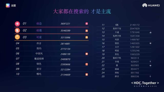 "动态"、"动漫"、"可爱"等关键词纷纷上榜,这些不同的搜索关键词,呈现了“各有态度”的用户偏好。年轻化的群体带来了日益强烈的个性化需求,华为对搜索数据进行深度分析,持续输出匹配用户需求的主题设计,迎来用户量、下载量的不断突破。