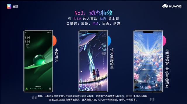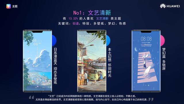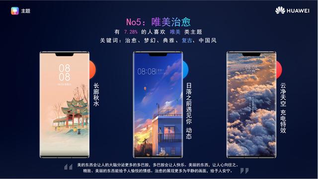 美的事物,会让人的大脑分泌更多的多巴胺,这种物质能让人产生愉悦的感觉。在华为主题用户之中,有7.28%的用户,更倾向于使用“唯美治愈”风格的主题。不同唯美治愈的画面,带给用户在使用终端产品时扑面而来的美感,从而用户就能感受到更多的愉悦。