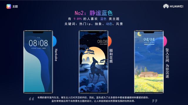 蓝色,不仅是2020流行色,更是华为主题用户喜爱的颜色。“静谧蓝色”拥有超过9.89%的华为主题用户拥戴,它象征着安静。选择和使用“静谧蓝色”相关的华为主题产品,让人们在繁忙单调的都市生活中感受到安静与平和的力量,更能让人体验到被自然景象所包围时的怡然自得。
