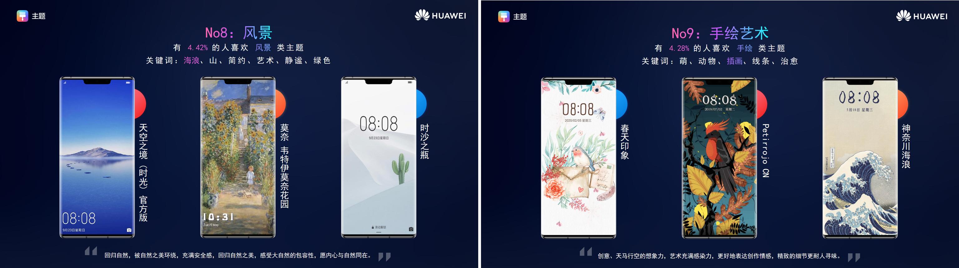 而多壁纸、软萌小可爱、风景、手绘艺术、纯净白色的风格类型,分别以6.26%、4.61%、4.42%、4.28%、4.23%的支持率,位列最受华为主题用户喜爱的top 10榜单。