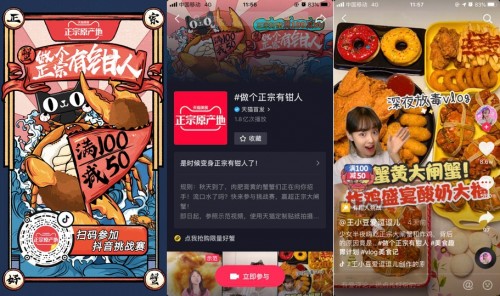 此外,针对不同年龄群的大闸蟹爱好者,天猫美食布局各大核心社交媒体阵地,开启了矩阵式的趣味传播互动。在微博发布#天猫尝鲜团#话题,通过趣味手绘大赛及街采等形式吸引各年龄层的网友参与互动讨论;又通过抖音发起#做个正宗有钳人#区域挑战赛,参赛者们纷纷晒出脑洞大开的创意视频。