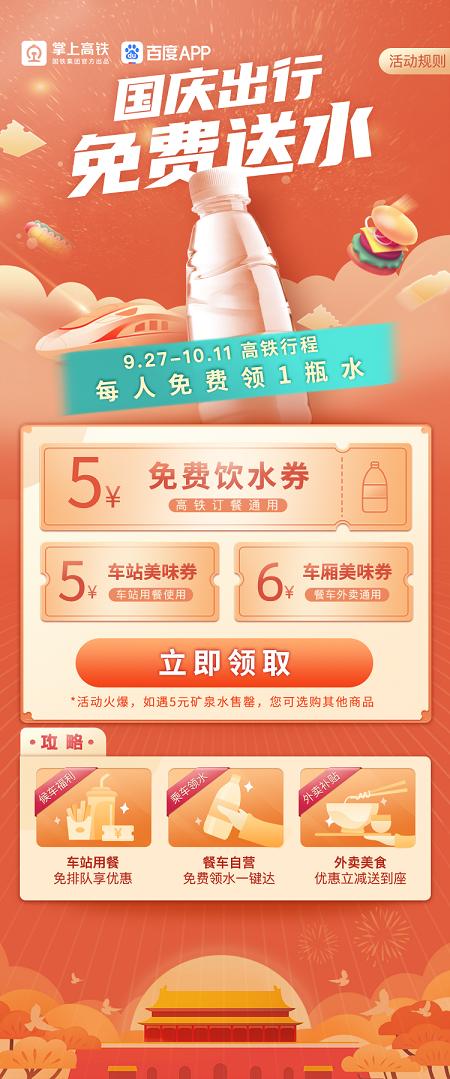 据悉,该活动自9月27日持续到10月11日,贯穿了整个国庆长假。在此期间有高铁行程的旅客,可以通过掌上高铁APP首页活动页面,或者在百度APP上搜索“高铁订餐”,进入活动页面领取免费饮水券。通过“高铁订餐”下单瓶装水,使用免费饮水券即可抵扣订单金额,下单成功后,列车工作人员将把水送至旅客的座位。