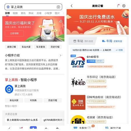 今年国庆期间乘坐高铁出行也有新变化,旅客通过高铁订餐可以免费领取瓶装水。这一便民服务由掌上高铁与百度APP联合推出,给广大旅客匆忙的行程中增加了一丝暖意和惊喜。